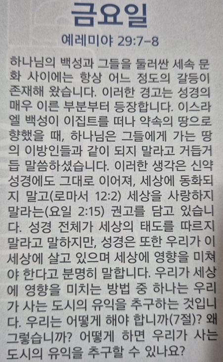 우리가 하나님을 믿고 그분을 알아가면 우리 삶의 형태가 바뀌게 됩니다. 그리고 우리의 변화는 이웃으로 흘러가야 합니다. 그래서 “그 성읍의 평안을 구하라”는 말씀은, 신앙을 내 개인의 안전만 생각해서 작아지게 만들지 말라는 것입니다. 우리는 세상을 이기기 위해 세상에 존재하는 것이 아니라, 하나님을 드러내기 위해 세상 가운데에 보냄 받은 사람들입니다.