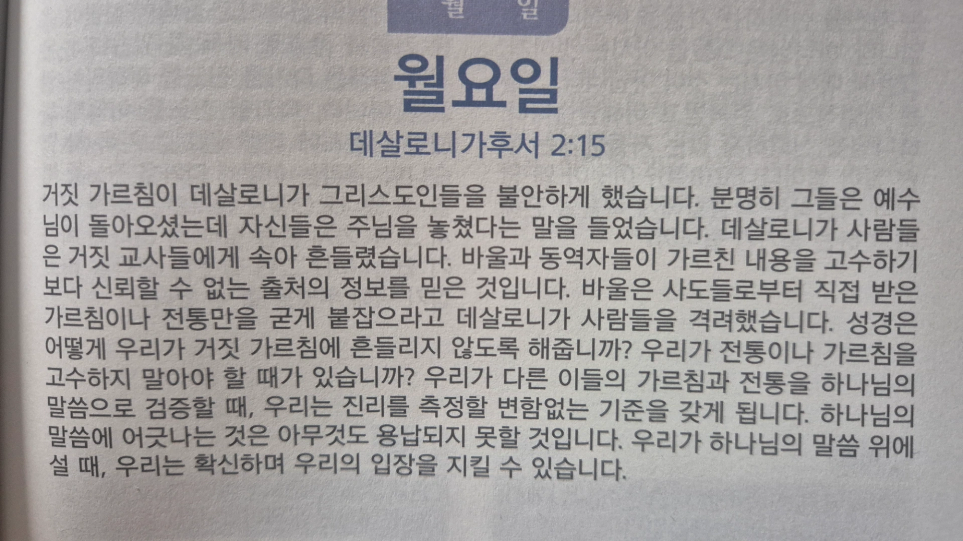 바울은 데살로니가 교회가 거짓 가르침과 혼란 속에서도 진리에 서는 공동체가 되길 원했습니다. 복음 위에 굳건하게 서는 것은 개인에게만이 아니라, 공동체 전체가 본이 되는 믿음으로 서라는 말씀입니다. 내가 흔들리지 않기 위해서만이 아니라, 누군가가 내 믿음을 보고 따라 배울 수 있도록 믿음으로 서야 합니다.