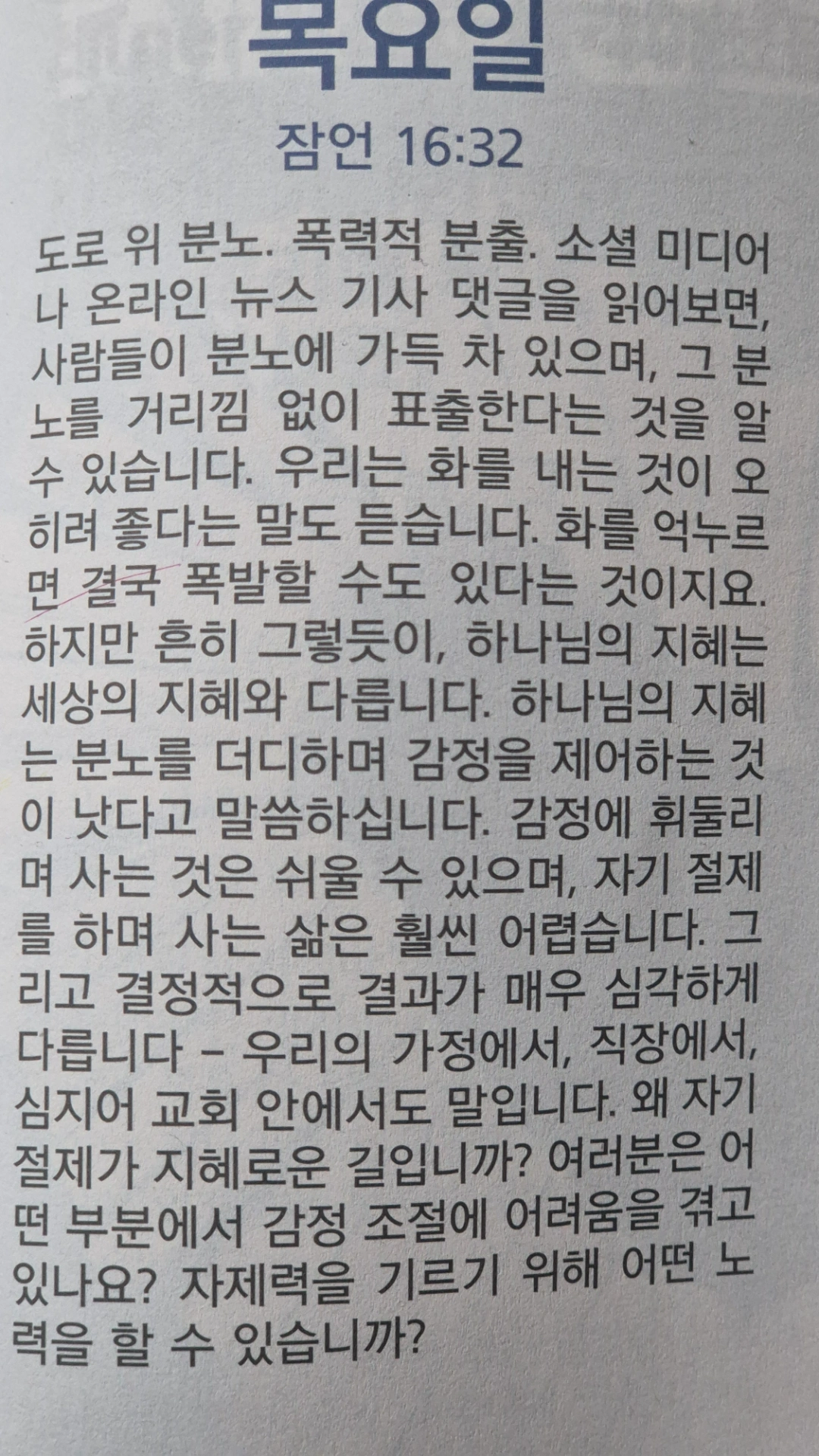 사랑하는 성도님들, 우리 청년 성도님들, 오늘도 성령님의 다스림을 받아 사람을 살리시기를 축복합니다. 잠언 16:32 “노하기를 더디하는 자는 용사보다 낫고, 자기의 마음을 다스리는 자는 성을 빼앗는 자보다 나으니라”