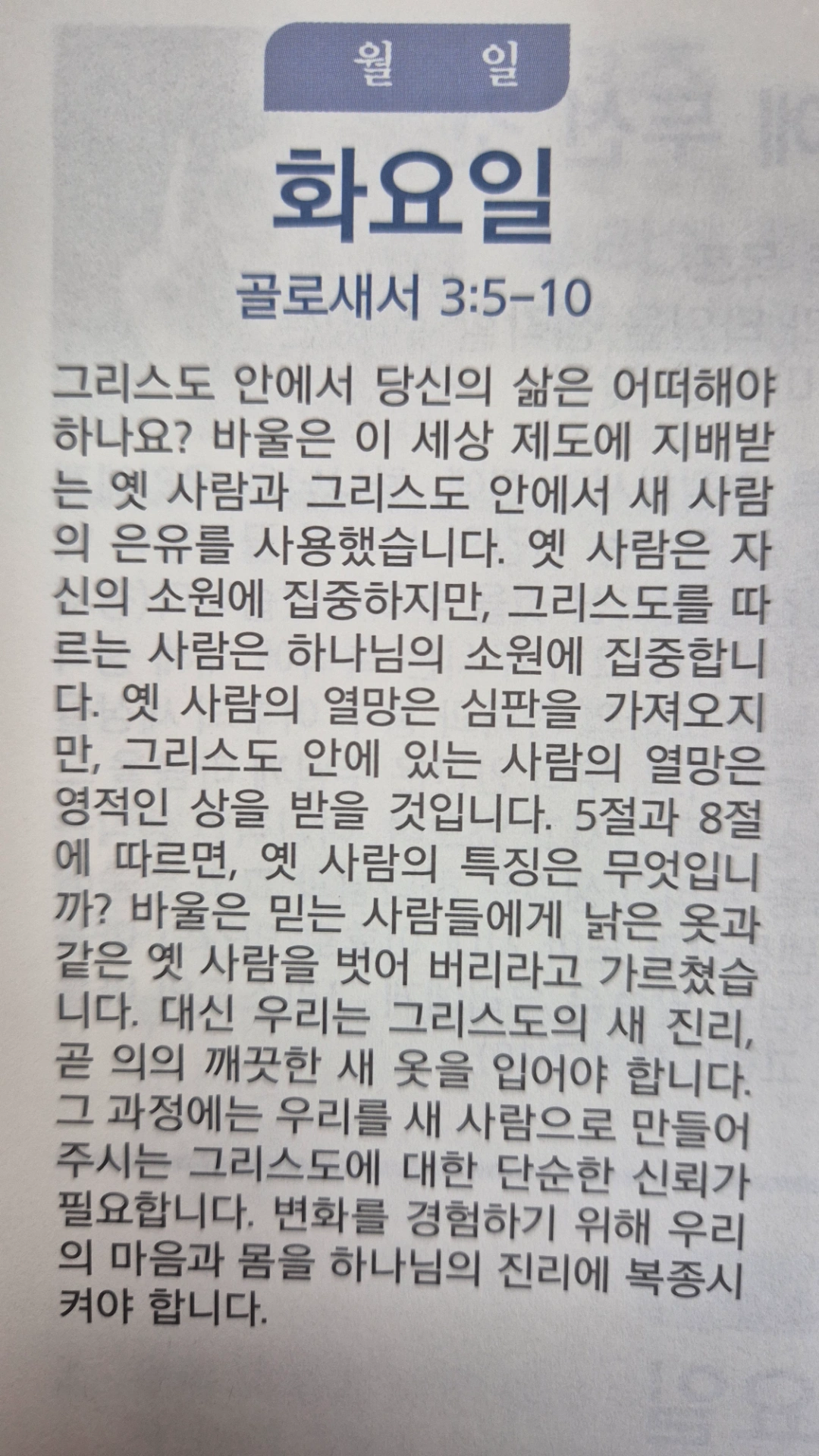 사랑하는 성도님들, 우리청년성도님들, 그리스도의 형기를 발하며 형통한 삶이 되기를 축복하며 기도합니다. 골 3:5-11 “5. 그러므로 땅에 있는 지체를 죽이라 곧 음란과 부정과 사욕과 악한 정욕과 탐심이니 탐심은 우상 숭배니라 6. 이것들로 말미암아 하나님의 진노가 임하느니라 7. 너희도 전에 그 가운데 살 때에는 그 가운데서 행하였으나 8. 이제는 너희가 이 모든 것을 벗어 버리라 곧 분함과 노여움과 악의와 비방과 너희 입의 부끄러운 말이라 9. 너희가 서로 거짓말을 하지 말라 옛 사람과 그 행위를 벗어 버리고 10. 새 사람을 입었으니 이는 자기를 창조하신 이의 형상을 따라 지식에까지 새롭게 하심을 입은 자니라 11. 거기에는 헬라인이나 유대인이나 할례파나 무할례파나 야만인이나 스구디아인이나 종이나 자유인이 차별이 있을 수 없나니 오직 그리스도는 만유시요 만유 안에 계시니라”