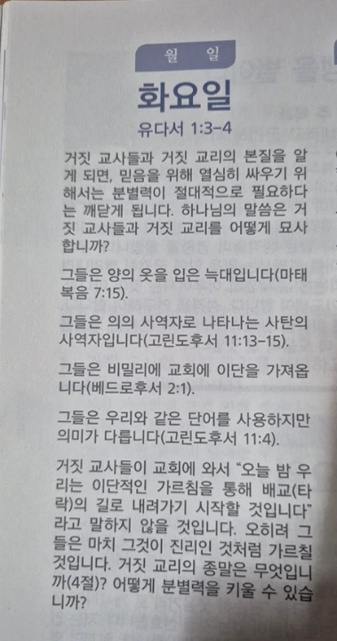 사랑하는 성도님들, 우리 청년성도님들, 오늘도 세상 유혹과 시험 속에서 복음으로 마음을 지키시기를 기도합니다. 유 1:3-4 “3. 사랑하는 자들아 우리가 일반으로 받은 구원에 관하여 내가 너희에게 편지하려는 생각이 간절하던 차에 성도에게 단번에 주신 믿음의 도를 위하여 힘써 싸우라는 편지로 너희를 권하여야 할 필요를 느꼈노니 4. 이는 가만히 들어온 사람 몇이 있음이라 그들은 옛적부터 이 판결을 받기로 미리 기록된 자니 경건하지 아니하여 우리 하나님의 은혜를 도리어 방탕한 것으로 바꾸고 홀로 하나이신 주재 곧 우리 주 예수 그리스도를 부인하는 자니라”