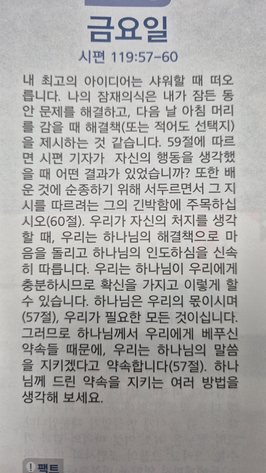 우리가 겪는 결핍은 단순히 무언가 모자란 상태가 아니라, 하나님으로 채워야 할 자리가 비어 있다는 영혼의 부르짖음입니다. 우리 인생의 메마른 결핍은 사실 하나님이라는 거대한 바다를 만날 수 있는 가장 복된 통로가 됩니다. 오늘 본문에서 시인은 그 마른 샘 바닥에서 고개를 들어 하나님을 바라봅니다. “여호와는 나의 분깃이시니 내가 주의 말씀을 지키리이다”라고 말입니다.