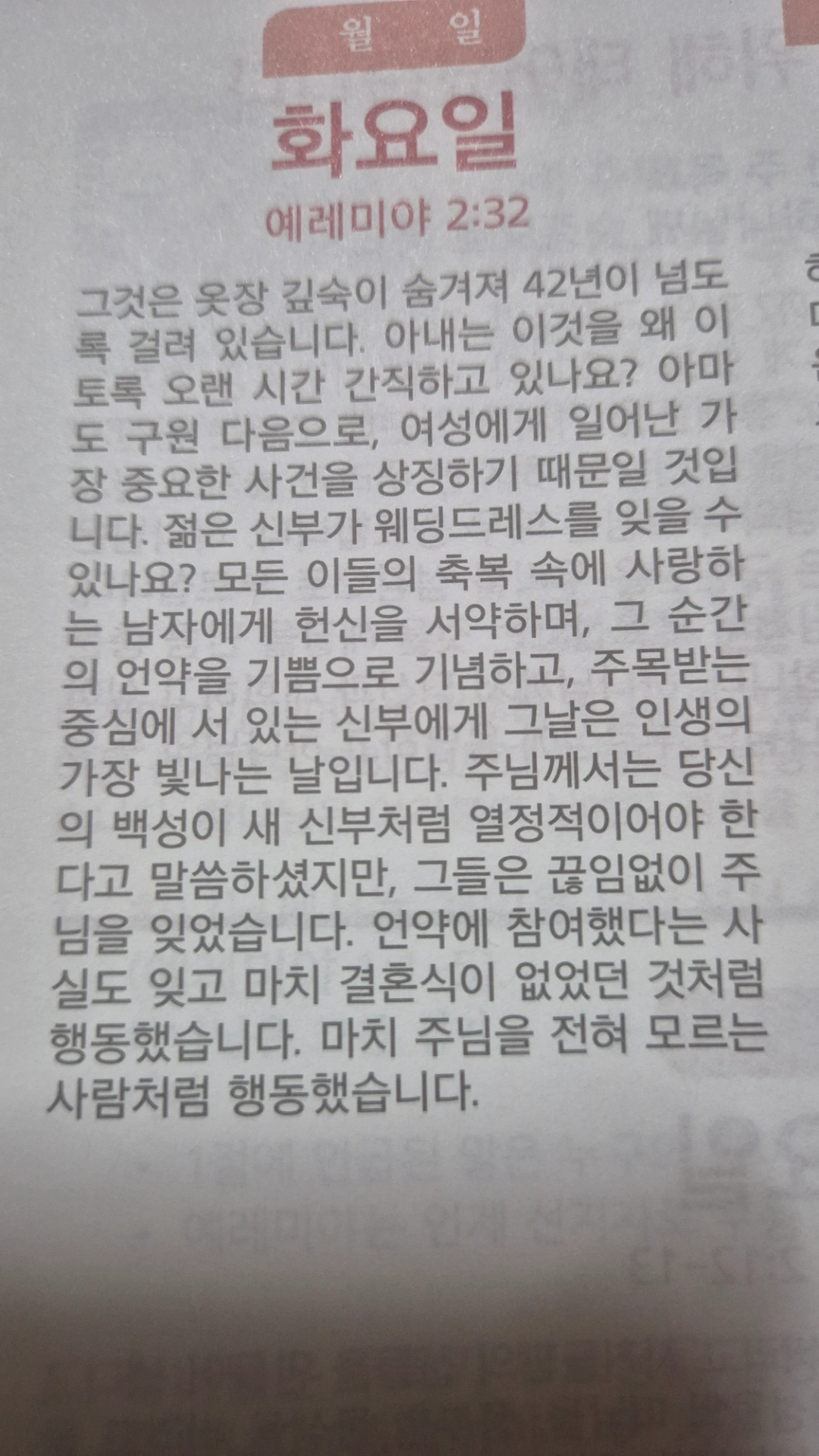 예레미야 2:32, “처녀가 어찌 그의 패물을 잊겠느냐 신부가 어찌 그의 예복을 잊겠느냐 오직 내 백성은 나를 잊었나니 그 날 수는 셀 수 없거늘”
