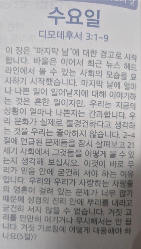 디모데후서 3:1-5 “1. 너는 이것을 알라 말세에 고통하는 때가 이르러 2. 사람들이 자기를 사랑하며 돈을 사랑하며 자랑하며 교만하며 비방하며 부모를 거역하며 감사하지 아니하며 거룩하지 아니하며 3. 무정하며 원통함을 풀지 아니하며 모함하며 절제하지 못하며 사나우며 선한 것을 좋아하지 아니하며 4. 배신하며 조급하며 자만하며 쾌락을 사랑하기를 하나님 사랑하는 것보다 더하며 5. 경건의 모양은 있으나 경건의 능력은 부인하니 이같은 자들에게서 네가 돌아서라”