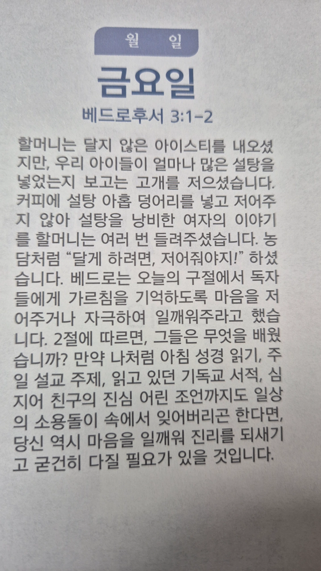 어른인 저도 하루만 지나도 어제 뭘 묵상했는지 다짐했는지 기억이 잘 안납니다. 심지어 아침 묵상도 잊을 때가 있습니다.