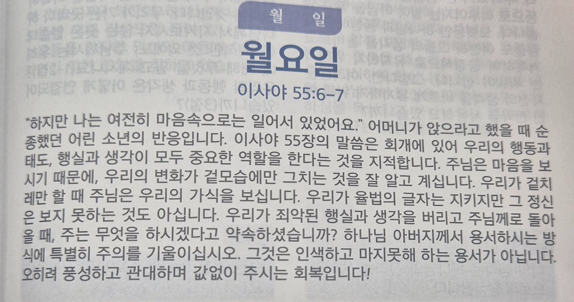 이사야는 이스라엘 백성에게 “너희는 여호와를 만날 만한 때에 찾으라. 가까이 계실 때에 그를 부르라”고 간절히 호소합니다. 하나님은 언제나 우리와 함께 계시지만, 우리 인생에는 하나님이 특별히 가까이 오셔서 말씀하시는 그분의 때가 있습니다. 이 타이밍을 놓치지 말아야 합니다. 다윗이 골리앗 앞에서 다른 사람들은 상상도 못한 승리를 맛보았던 것처럼, 우리도 믿음의 눈을 들어야 그 길을 보고 승리를 맛볼 수 있습니다. 그 길을 보려면, 쥐가 고양이를 피하듯 도망칠 것이 아니라, 맹렬히 우리를 사랑하사 찾아오시는 그분께 필사적으로 응답하는 매 순간이 되어야 합니다.