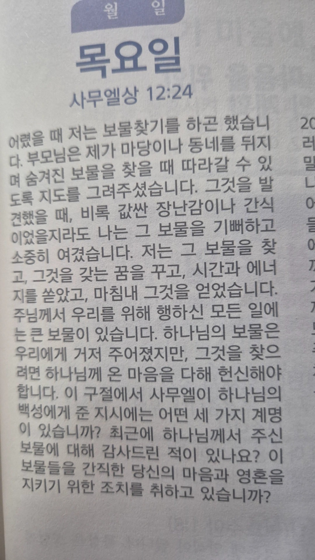 하나님이 주신 구원의 은혜와 가족, 말씀, 평강.. 이런 보물들을 헤아려 보며 의식적으로 기억하시기를 바랍니다. 그리고 그 보물을 지키기 위해, 말과 기도, 예배가 결심을 넘어 삶의 방식이 되도록 하시기를 바랍니다.