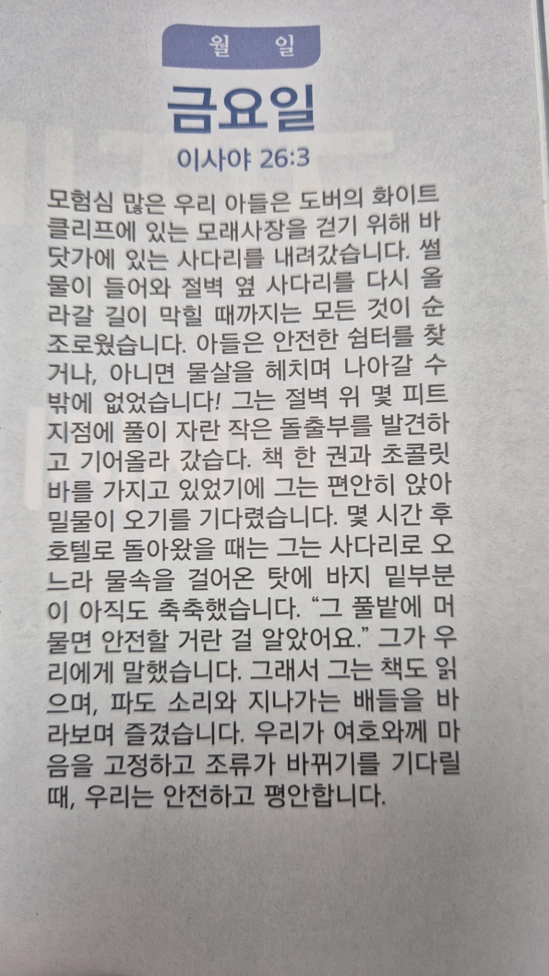 하나님을 참되게 믿는 신앙은 잠깐 감정이 올라갔다가 금방 내려오는 기분이 아니라, 매일 매일 하나님을 향하고 순종하는 작은 결단이 쌓여지는 것입니다. 하나님을 신뢰한다는 것은 감정이 아니라 결단입니다. 불안이 사라질 때까지 기다리는 것이 아니라 불안한 가운데서도 주님께 마음을 두는 것입니다.