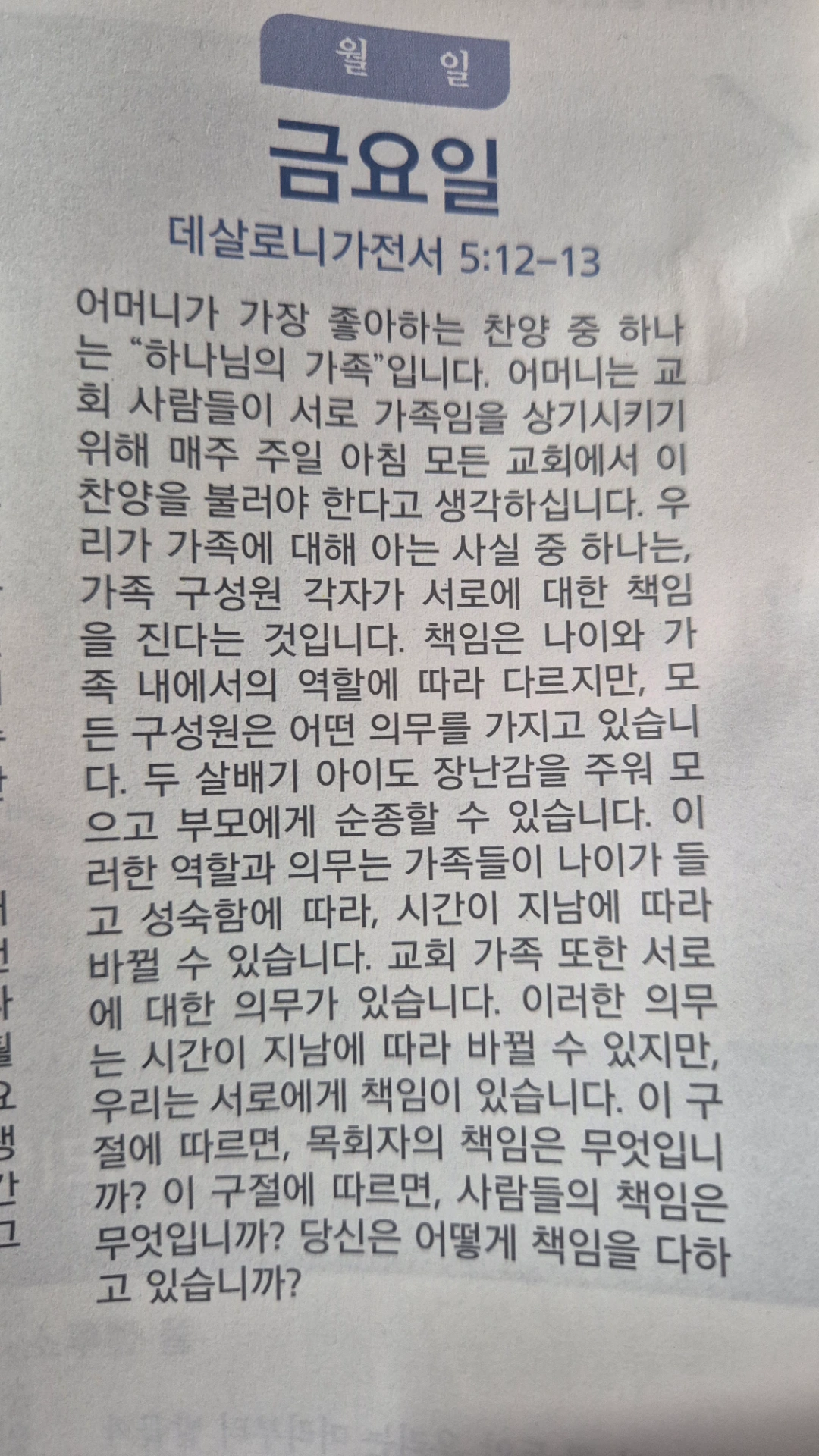 교회도 그렇습니다. 교회는 한 사람, 혹은 몇 사람이 세우는 곳이 아닙니다. 바울은 교회를 가족으로 부르면서, 목회자에게 맡겨진 책임이 있고 성도에게 맡겨진 책임이 있다고 말합니다. 성도는 수고하는 사역자들을 알아주고 존중하는 일, 그리고 서로 화목하게 하는 일을 해야 합니다. 이것은 선택이 아니라 가족의 의무입니다.