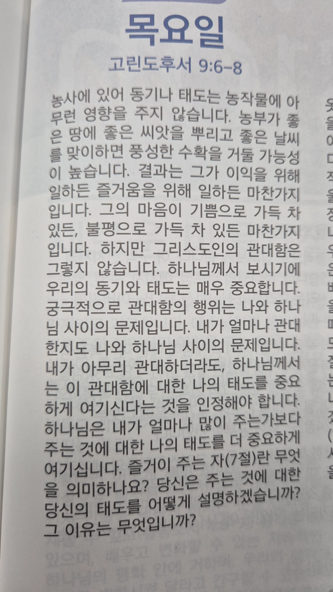고후 9:8의 “항상 모든 것이 넉넉하여 모든 착한 일을 넘치게 하게 하려 하심이라”는 약속은, 우리를 부요하게 만들어 자랑하게 하려고 하심이 아니라, 우리를 넓혀 이웃을 섬기게 하려는 하나님의 배려하심입니다. 하나님은 우리를 가난하게 하셔서 손을 비우게 만들려는 분이 아니라, 우리를 부요하게 만들어 손을 열어 흘려보내는 사람으로 만들려는 분이십니다.
